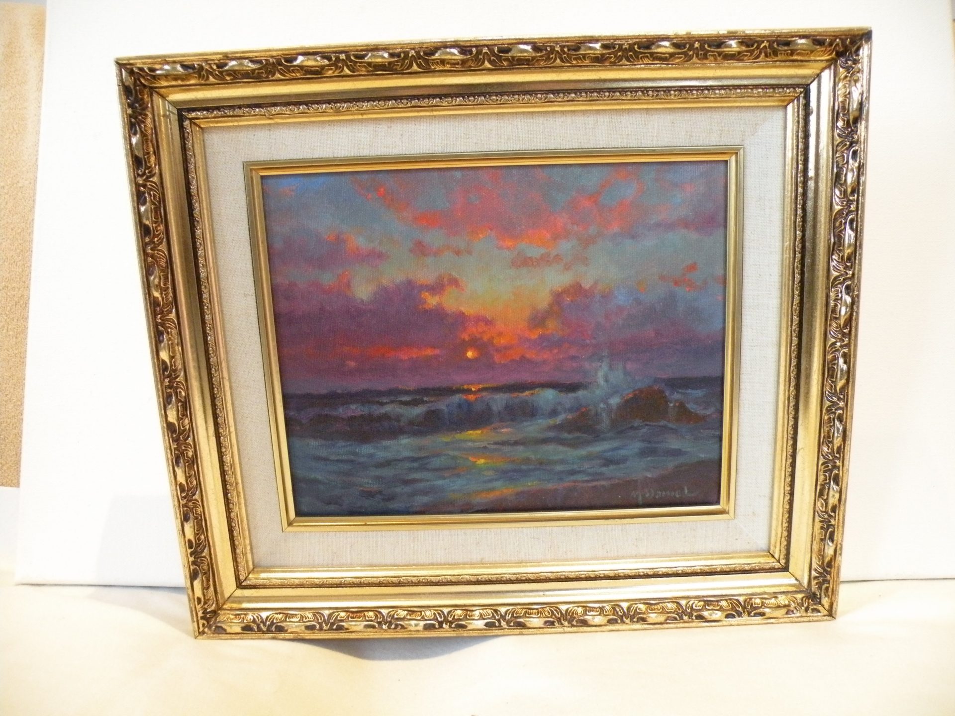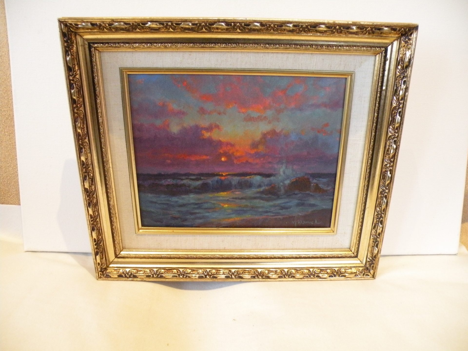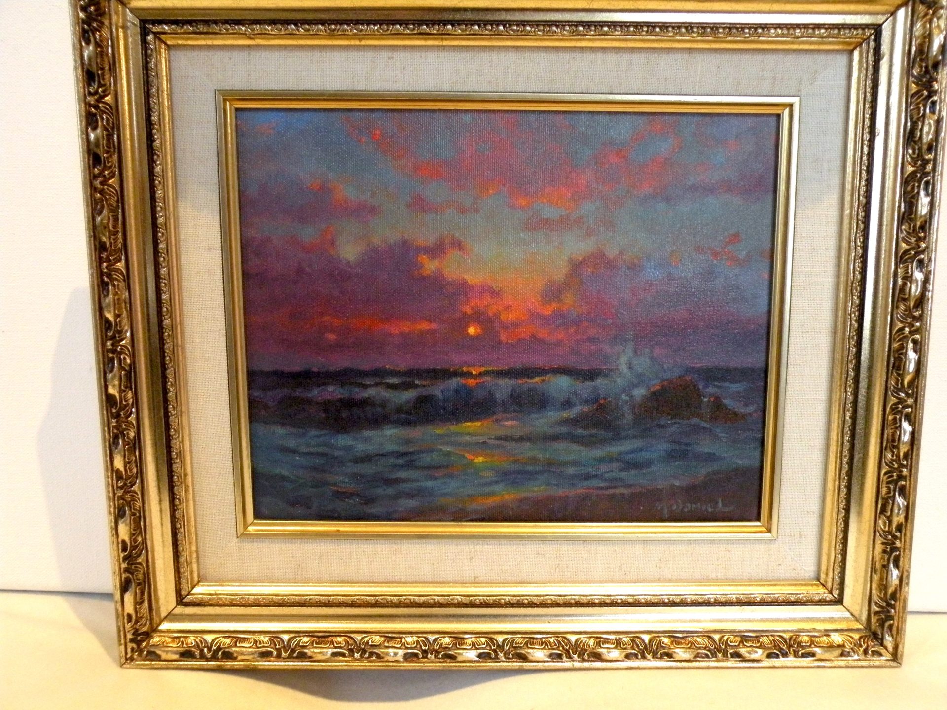 “Sailors Delight”…. The brilliant sky at night is supposed to predict good weather. This image is a dramatic riot of sunset colors ranging from dark ocean waves with reflected sky lights to the horizon and up to the clouds brilliantly lit by the setting sun. This has it all. This painting is signed in the lower right corner and en verso with the title. artist signature and date 9-8-95. The painting is in excellent condition, with the fabric liner showing showing some slight staining. The ornate frame is in good condition. The canvas is 8 x 10” and the overall size is 12 x 14 inches. This was framed by the artist. Domestic shipping is included.