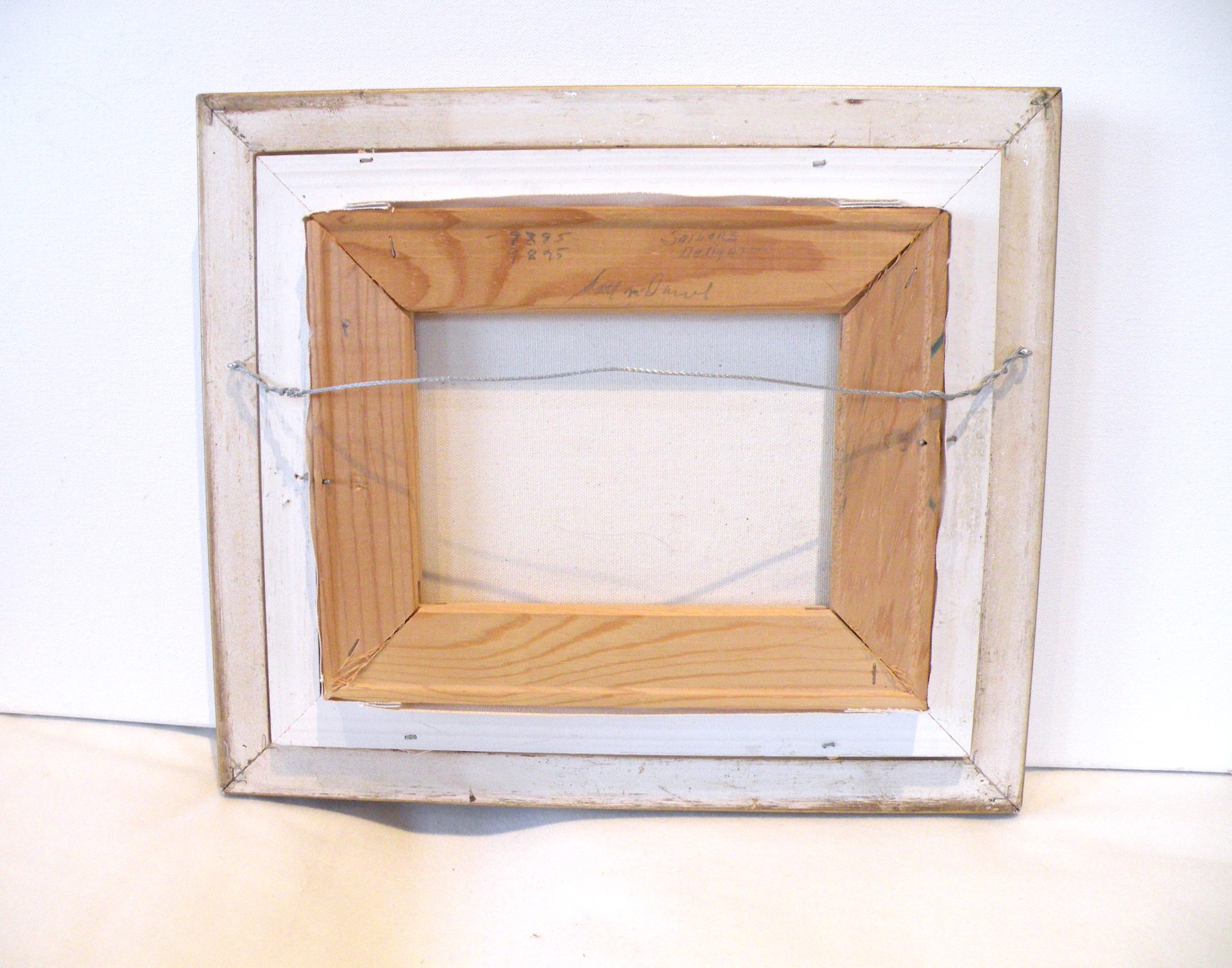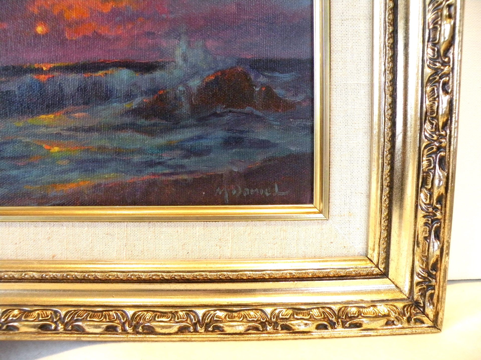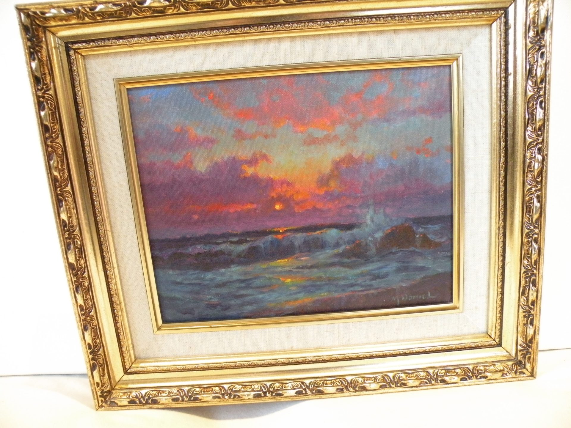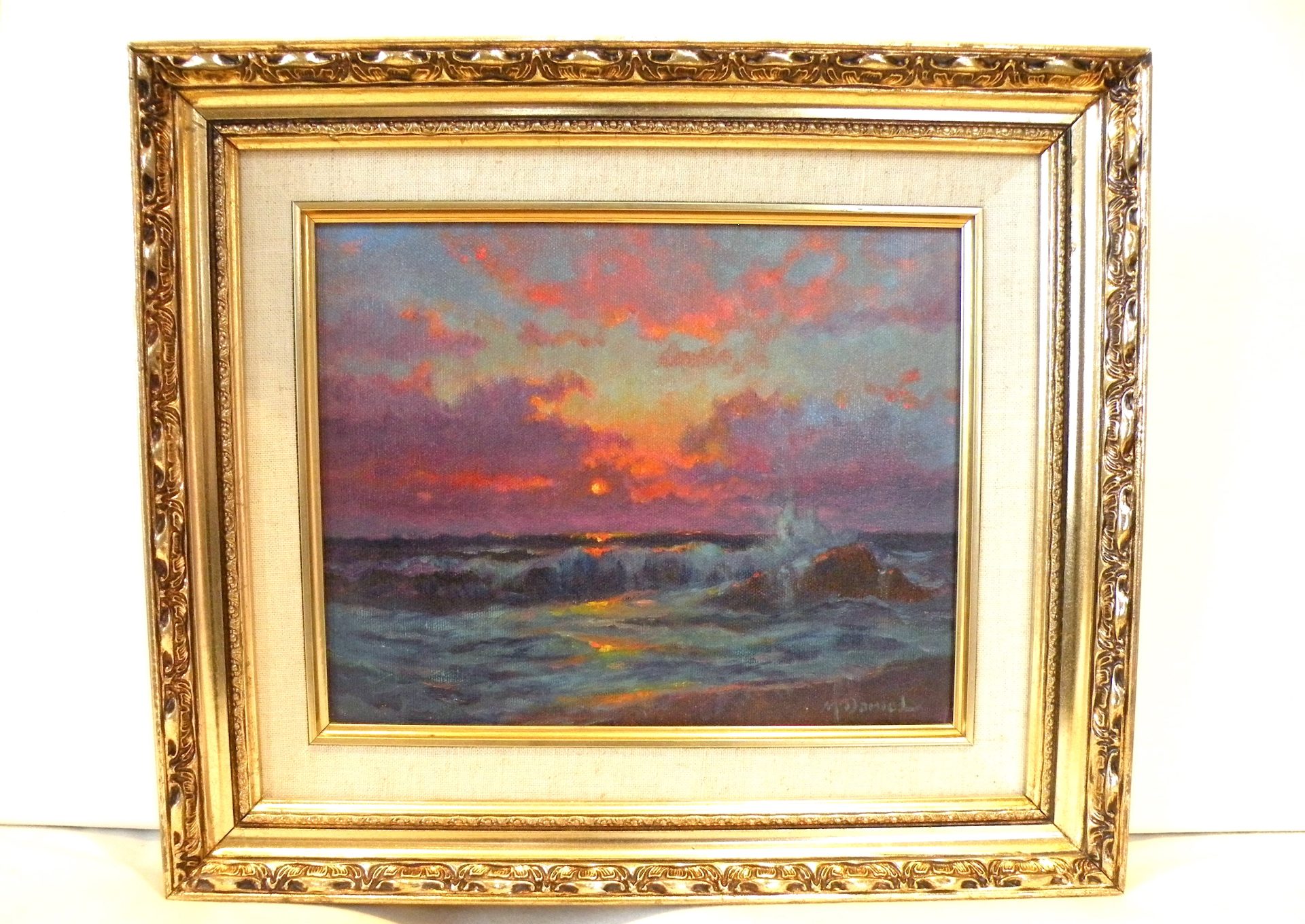 “Sailors Delight”…. The brilliant sky at night is supposed to predict good weather. This image is a dramatic riot of sunset colors ranging from dark ocean waves with reflected sky lights to the horizon and up to the clouds brilliantly lit by the setting sun. This has it all. This painting is signed in the lower right corner and en verso with the title. artist signature and date 9-8-95. The painting is in excellent condition, with the fabric liner showing showing some slight staining. The ornate frame is in good condition. The canvas is 8 x 10” and the overall size is 12 x 14 inches. This was framed by the artist. Domestic shipping is included.