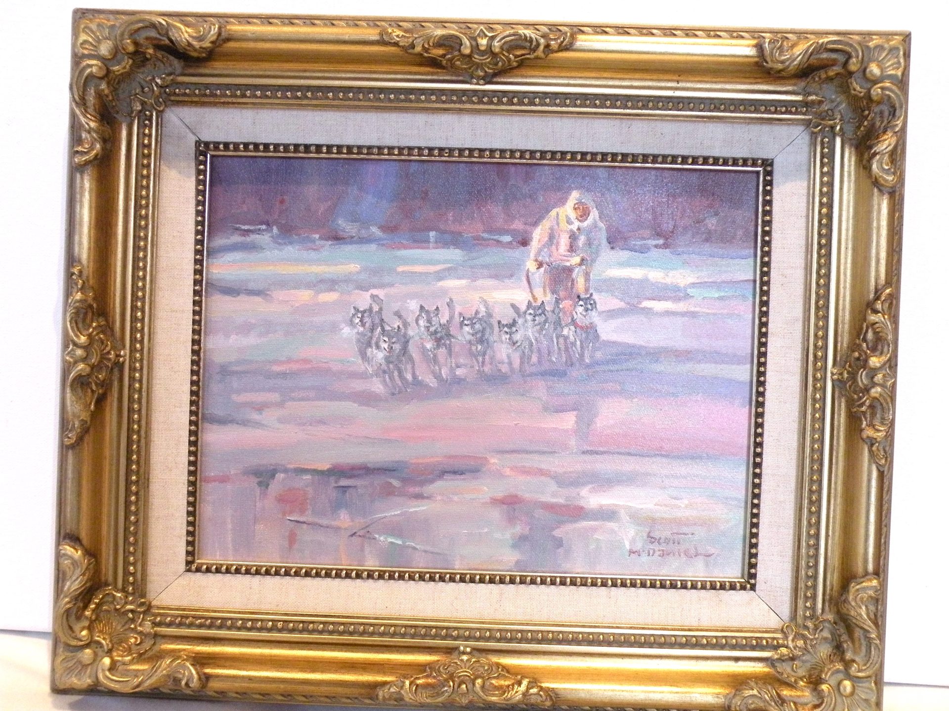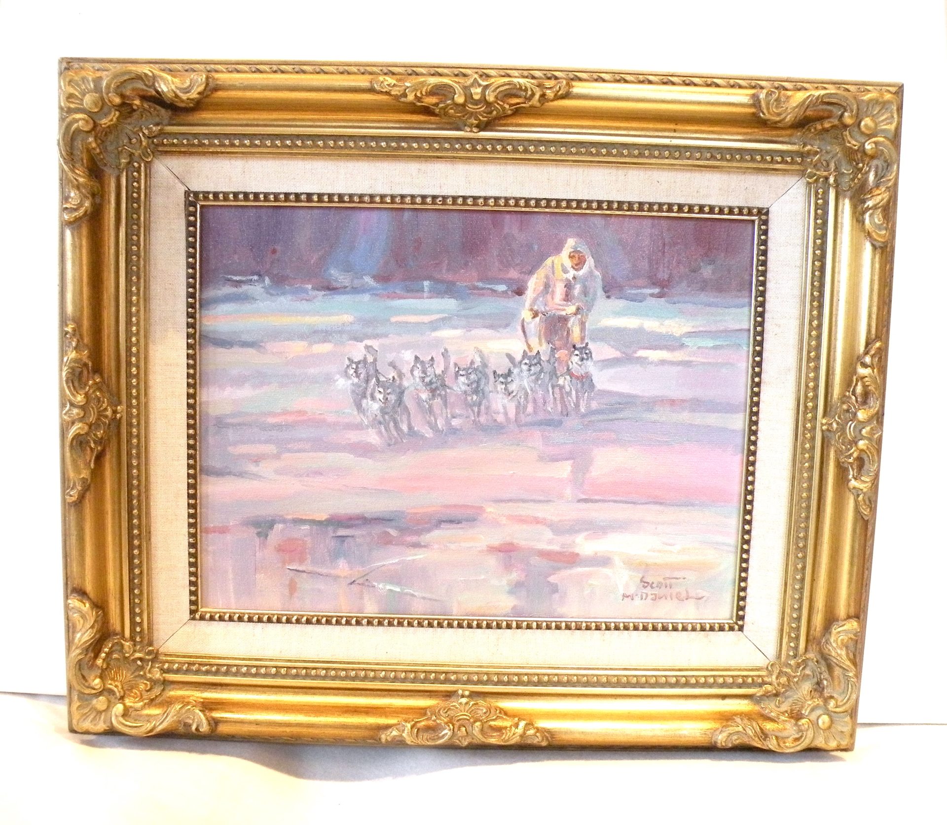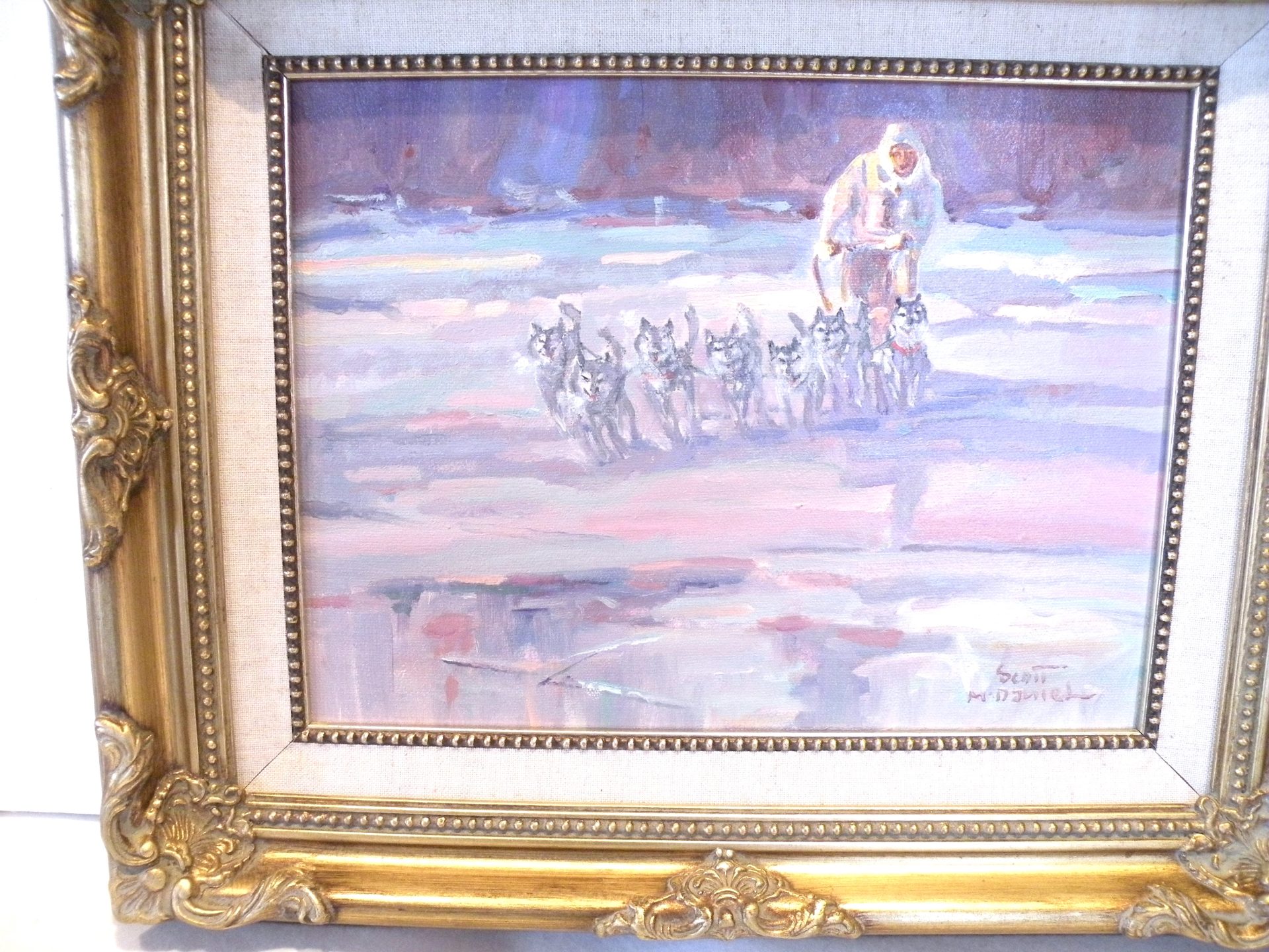 This action packed image of a Musher and his dogs running full out and just missing the hidden water under the ice is typical of paintings by Scott McDaniel (1926 -2012) ..Always something going on. The colors in the painting convey the cold atmosphere and the ominous sky. The painting is signed in the lower right corner and en verso with the title, artist signature and date 1-24-90 or 12-4-90. There is also a personal note from the artist. The painting is in excellent condition with the fabric liner showing some staining. The ornate frame is in good condition. This was framed by the artist. Domestic shipping will be included.