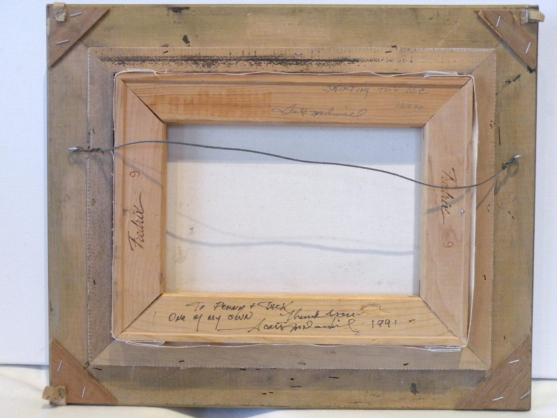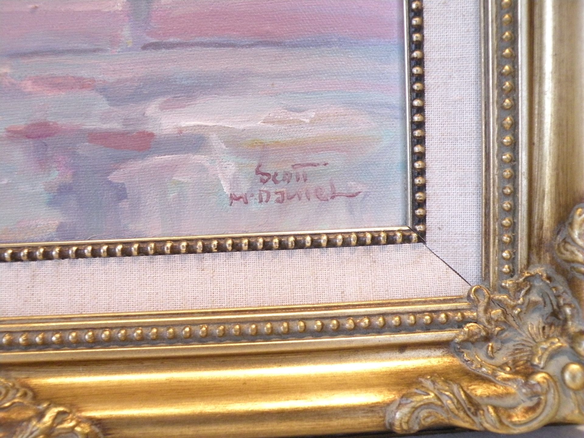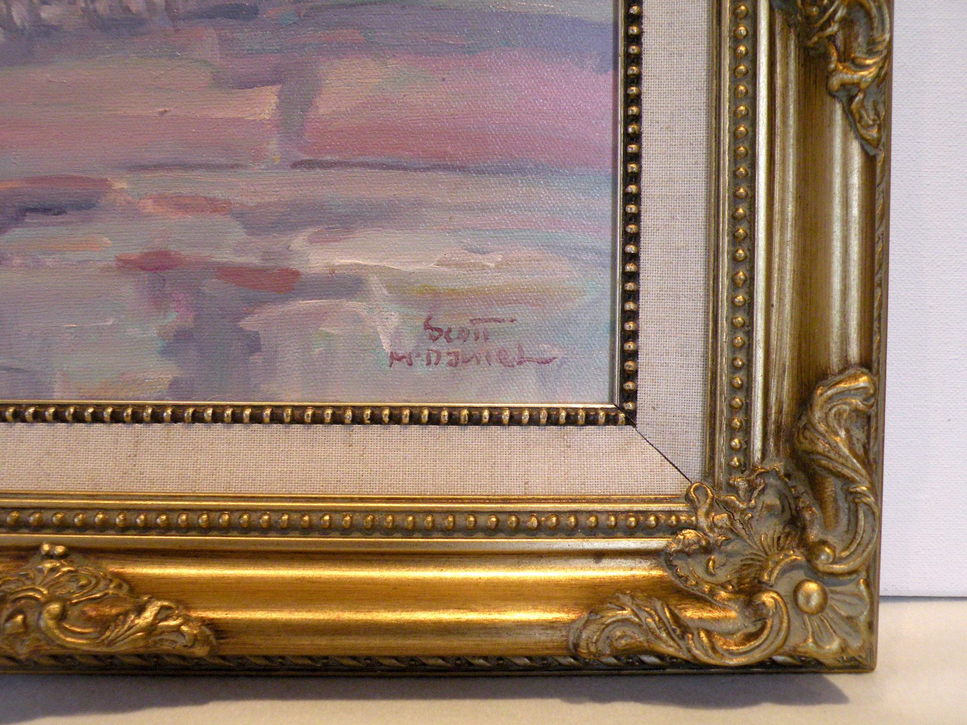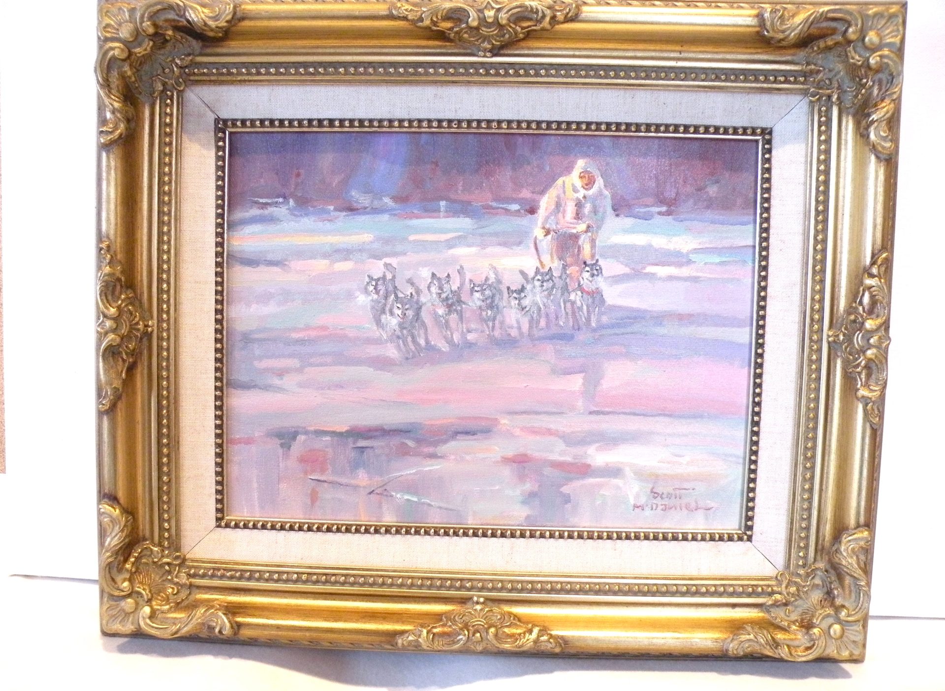 This action packed image of a Musher and his dogs running full out and just missing the hidden water under the ice is typical of paintings by Scott McDaniel (1926 -2012) ..Always something going on. The colors in the painting convey the cold atmosphere and the ominous sky. The painting is signed in the lower right corner and en verso with the title, artist signature and date 1-24-90 or 12-4-90. There is also a personal note from the artist. The painting is in excellent condition with the fabric liner showing some staining. The ornate frame is in good condition. This was framed by the artist. Domestic shipping will be included.